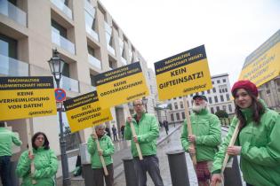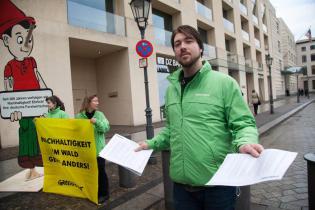 Gleichzeitig haben Greenpeace-Aktivisten heute die Mitglieder des Deutschen Forstwirtschaftsrat (DFWR) in Berlin am Pariser Platz mit einem 3,5 Meter hohen Pinocchio begrüßt, der eine 100 Zentimeter lange Lügennase trägt. Die Figur hält ein Schild in den Händen mit dem Spruch „Seit 300 Jahren verfolgen wir Nachhaltigkeit! Ehrlich! Ihre deutsche Forstwirtschaft“. Auf einem Banner ist zu lesen: „Nachhaltigkeit im Wald geht anders!“. An der Jubiläums-Veranstaltung des DFWR zu 300 Jahren Nachhaltigkeit nimmt auch Bundeskanzlerin Merkel teil. „Die Nachhaltigkeit der deutschen Forstwirtschaft ist durch die schleichende Vernichtung alter Buchenwälder nur noch ein Mythos“, sagt Martin Kaiser, Klima- und Waldexperte bei Greenpeace.