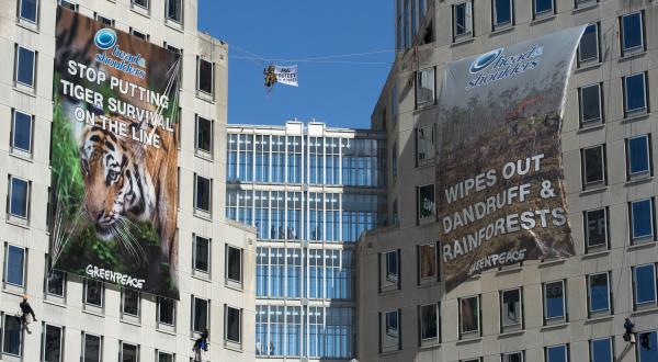 Die Führungsetage von P&G in Cincinnati im US-Bundesstaat Ohio erhielt Besuch der etwas anderen Art: Neun Greenpeace-Aktivisten, einer von ihnen im Tigerkostüm, entrollten an den beiden Türmen des amerikanischen Firmensitzes zwei fünfzehn Meter hohe Banner. Sie protestierten damit gegen die Raubbau-Praxis zweifelhafter Palmölproduzenten, von denen P&G Palmöl bezieht.