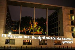 • Greenpeace-Aktivist:innen fordern in Berlin den Stopp des umwelt- und klimaschädlichen Handelsabkommens zwischen der EU und den Mercosur-Staaten. In den frühen Morgenstunden projizieren sie "Brandgefahr für den Amazonas: Stoppt das EU-Mercosur-Abkommen" an die Fassade des Auswärtigen Amtes.