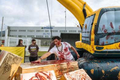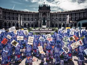 • Mit 316 symbolischen Milka-Schokohasen protestieren Greenpeace-Aktivist:innen am Wiener Heldenplatz gegen Waldzerstörung und Menschenrechtsverletzungen entlang der Lieferkette von Milka.