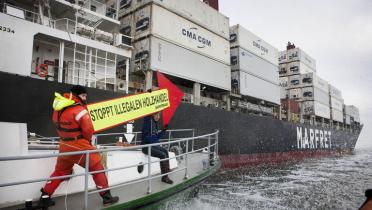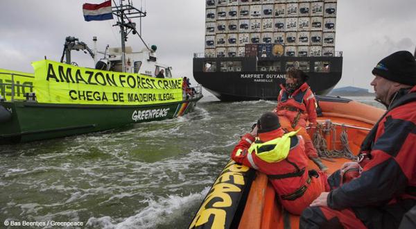 Greenpeace-Aktivisten fuhren der „Marfret Guyane“ auf der Nordsee mit Schlauchbooten entgegen: Das Schiff hat Container mit Holz an Bord, die vom brasilianischen Holzexporteur Rainbow Trading stammen. Der ist in illegalen Holzhandel verstrickt. „Amazon Forest Crime“ – Amazonas-Verbrechen – prangte auf dem Banner der Umweltschützer. Es soll der Besatzung, aber auch den EU-Behörden klar machen: Hier spielt sich ein Verbrechen ab.