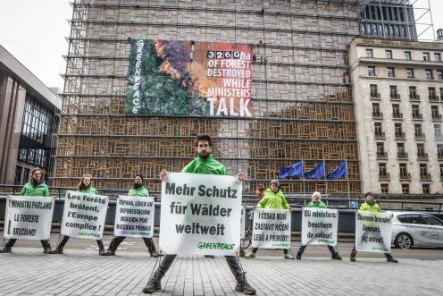 Greenpeace-Aktivist:innen setzten sich im März 2022 am Hauptsitz des EU-Rates in Brüssel für mehr Waldschutz ein.