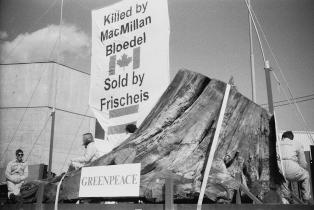 Greenpeace-Aktive ketten sich 1994 vor dem Holzunternehmen Frischeis an einen 400 Jahre alten Baumstumpf "Stumpy" aus dem Clayoquot-Sund. Gleichzeitig an das Eingangstor und verhinderten so die Durchfahrt von Lastwagen. Der riesige Stumpf wurde 1988 von MacMillan Bloedel gefällt. Frischeis in Stockerau, Österreich, ist einer der größten österreichischen Importeure von Holz aus Kanada.