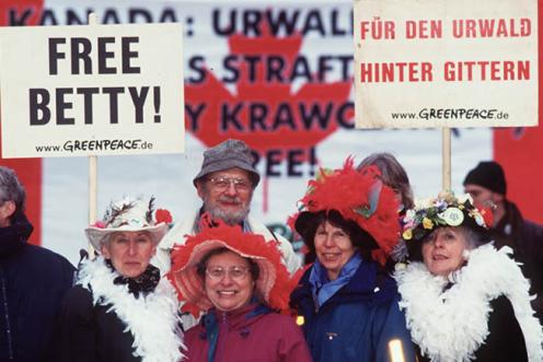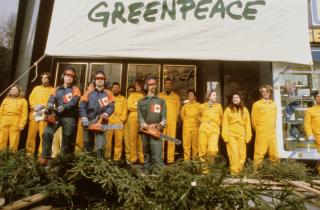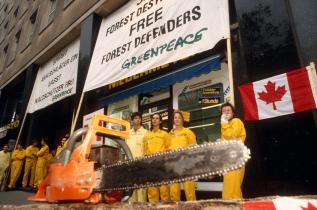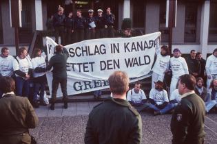 Schon seit Jahren schwelen Konflikte um die Kahlschläge im einzigartigen Great-Bear-Regenwaldwalds an der Westküste Kanadas. Es spitzt sich zu: Bei Protesten und Blockaden werden mehr als 900 Menschen im Waldgebiet Clayoquot Sound auf Vancouver Island festgenommen – unter ihnen der damalige Geschäftsführer von Greenpeace Deutschland, Thilo Bode. Die dramatische Abholzung erregt so international Aufmerksamkeit. Greenpeace protestiert vor der kanadischen Botschaft in Deutschland und Österreich.