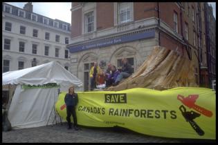 Auch im Covent Garden in London protestiert Greenpeace 1994 mit Stumpy. Stumpy ist ein Baumstamm, der in den Wäldern von British Columbia gefällt wurde. Ein Symbol für die Rücksichtslose Zerstörung der Urwälder Kanadas für kurzfristigen Profit.