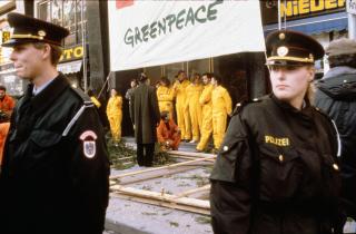 Greenpeace-Protest vor der kanadischen Botschaft in Wien, Österreich (1993).