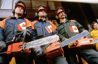 Sechs Kettensägen und Trompeten spielen die kanadische Hymne. Gleichzeitig holzen die Greenpeace-"Holzfäller" vor der kanadischen Botschaft in Wien einen Wald von 16 Fichten ab. Sie fordern die sofortige Freilassung der acht Greenpeace-Kolleg:innen in Vancouver/Kanada und einen Stopp der Abholzung im kanadischen Clayoquot Sound.
