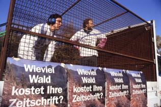 "Wieviel Wald kostet Ihre Zeitschrift?", Greenpeace Aktivist:innen machen auf die rücksichtslose Abholzung des kanadischen Great Bear Rainforest aufmerksam. Gleichzeitig protestieren sie gegen die Verhaftung von Thilo Bode.
