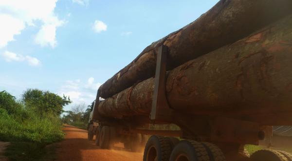 Siforco-LKW, der Baumstämme zum Dorf Bossanga transportiert.