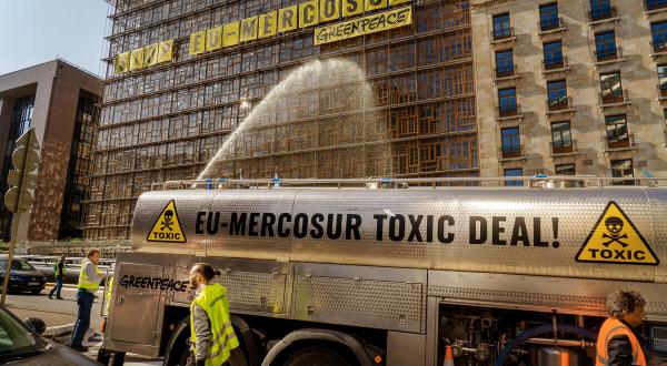 Die Aktiven aus Deutschland, Belgien, den Niederlanden, Frankreich und Schweden klettern hier, weil heute im Europagebäude die Handelsminister:innen aller EU-Mitgliedstaaten tagen. Während die Politiker:innen also drinnen über Handelsthemen diskutieren, demonstrieren die Greenpeace-Aktiven draußen gegen das umstrittene EU-Mercosur-Freihandelsabkommen. Die EU-Kommission möchte den Deal zwischen der EU und den Mercosur-Staaten Brasilien, Argentinien, Paraguay und Uruguay noch in diesem Jahr abschließen. Dieser Giftvertrag würde unter anderem den Handel mit Pestiziden und den Kreislauf des Gifts antreiben: Europäische Unternehmen, darunter die deutschen Chemiekonzerne Bayer und BASF, können mit dem Deal verstärkt Pestizide in die Mercosur-Staaten exportieren. Dazu gehören auch Pestizide, die so giftig sind, dass sie in der EU nicht zugelassen sind. Und diese verbotenen Pestizide gelangen durch Lebensmittelexporte aus dem Mercosur auch wieder in die Supermärkte in Deutschland.