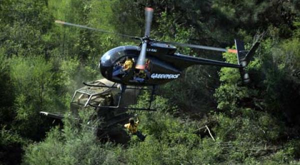 Mit einer spektakulären Aktion in bester James-Bond-Manier haben Greenpeace-Aktivisten in Argentinien am Wochenende die Urwaldzerstörung in der nördlichen Provinz Chaco gestoppt. Sie seilten sich von einem Hubschrauber unmittelbar vor den Kettenfahrzeugen mit ihren Protestbannern ab.