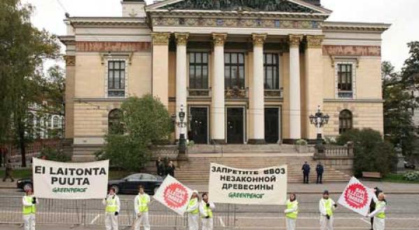 Regelmäßig passieren LKW mit illegal geschlagenem Holz aus der russischen Region Karelien die finnische Grenze. Gegen diesen Frevel haben Greenpeace-Aktivisten am Dienstag in Helsinki protestiert. Dort treffen sich derzeit die EU-Umweltminister mit Vertretern der russischen Regierung. Die Greenpeacer forderten alle Teilnehmer der Konferenz auf, den Handel mit Holz aus illegalem und zerstörerischem Einschlag endlich zu unterbinden.