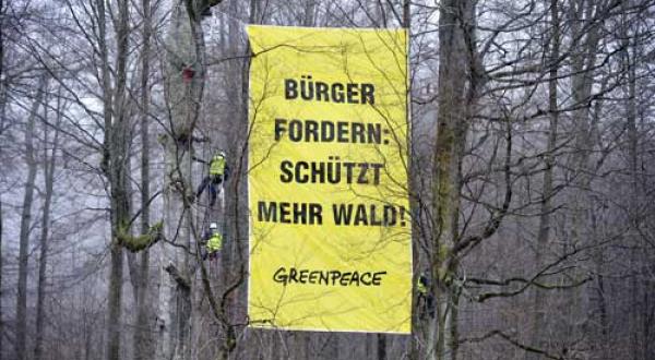 Greenpeace-Aktivisten protestieren im Spessart für mehr Waldschutz. Zwischen zwei Buchen haben sie ein sechs mal neun Meter großes Banner befestigt, auf dem steht: Bürger fordern: Schützt mehr Wald! Mit ihrer Forderung sind die Aktivisten in bester Gesellschaft. Das zeigt eine repräsentative Meinungsumfrage des Forsa-Instituts im Auftrag von Greenpeace.