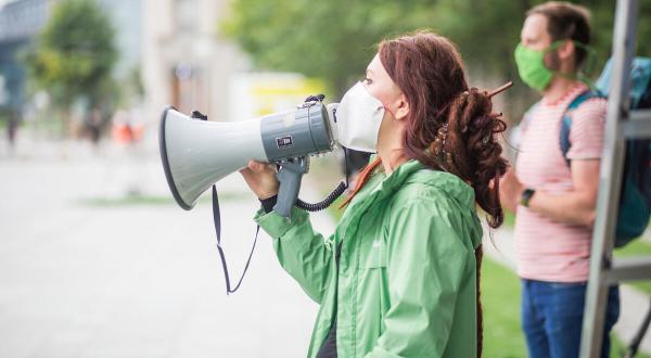 Am besten verbreiten sich Aerosole, wenn man ruft oder schreit. Deswegen solltest du dies auf Demos vermeiden. Überlege dir lieber, wie du stattdessen „laut“ werden kannst. Mit einem großen Banner, Musik oder Trommeln – die Möglichkeiten sind vielfältig.