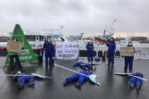 Um diese Gefahr zu verdeutlichen, haben wir die Laute dieser Tests abgespielt und sind bei der Explosion umgefallen. Dabei hatten wir große Holz-Wale an Stäben in der Hand. Wir fordern den Stopp aller seismischen Tests. Ohne Wale bricht das Ökosystem Meer zusammen. Die Wale brauchen echte Schutzgebiete, als Rückzugsorte, um ungestört leben zu können. 30% der Meere müssen bis 2030 unter Schutz gestellt werden. Nur so erhalten wir die Artenvielfalt der hohen See und können den schlimmsten Auswirkungen der Klimakrise entrinnen.