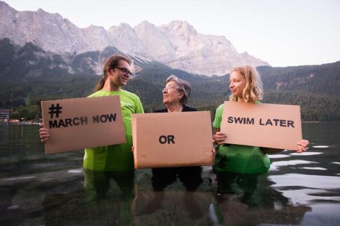 Eibsee nähe Zugspitze: Greenpeace-Jugendliche Maria Meyer (16) aus Augsburg und Cedric Hinrich (15) aus Karlsruhe und Klima-Aktivistin Gisela Johannsen (87) stehen hüfttief im Wasser. Unter dem Hashtag #march now or swim later rufen sie mit der Fotoaktion zur weltweiten Fridays for Future Demonstration am 20. 09. 2019 auf.