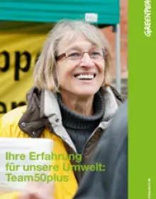 Team50plus-Gruppen arbeiten eng mit den lokalen Greenpeace-Gruppen zusammen. Hoch motiviert, kreativ und flexibel hauchen sie so mancher Idee erst Leben ein. Sie informieren auf Messen und Wochenmärkten über den Zustand überfischter Meere und bringen Schüler:innen den Wert der Urwälder nahe. Sie bieten konkrete Beratung und Tipps immer ganz dicht am praktischen Alltagsleben an: Etwa wie sich zuhause auf Ökostrom umstellen lässt und Mensch so zur Energiewende beitragen kann. Sogar in Schlauchbooten finden sich die 50+ immer häufiger - zusammen mit den jüngeren Greenpeacer:innen gegen Umweltsünden.