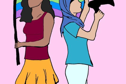 Zwei weiblich und nicht weiß gelesene Personen vor hellem Hintergrund. Die linke Person trägt einen gelben Rock und rotes Oberteil. Sie hält eine Pride Flag. Die Rechte Person steht mit Megaphone und erhobenen Zeigefinger daneben. Sie trögt ein blaues Kopftuch, ein hellblaues Tshirt und eine weiße Hose.