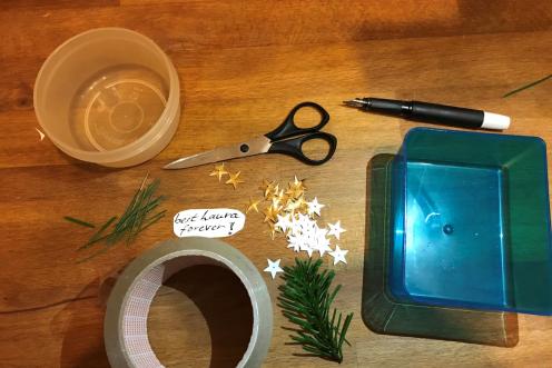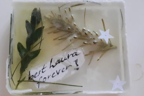2. Nimm jetzt deinen Gegenstand oder Zettel, der in die Seife rein soll. Wenn du etwas auf einen Zettel schreibst, solltest du ihn mit Tesafilm umkleben oder vorher ausdrucken, damit die Schrift später in der Seife nicht verläuft. Du kannst auch Pflanzenblätter oder Konfetti, ein kleines Spielzeug aus Lego, Deko-Herzchen aus Stoff oder Tannennadeln nehmen. Blütenblätter besser nicht, die vertragen die heiße Seife nicht und schrumpfen und verfärben sich.