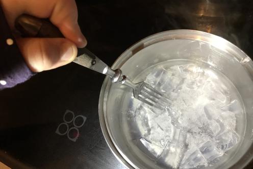 1. Schneide die gewünschte Menge Seife in Stückchen, schmelze sie direkt auf dem Herd und rühre dabei mit einer Gabel um, bis die Seife geschmolzen ist. Lasse dir dabei unbedingt von einer erwachsenen Person helfen, du kannst dich sonst leicht verbrennen!