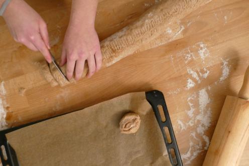 Anschließend schneidest du sie in 2-3 cm dicke Scheiben. Lege die Scheiben mit Abstand (die Zimtschnecken gehen beim Backen noch auf) auf ein Blech mit Backpapier und lasse sie noch einmal für eine halbe Stunde bei Zimmertemperatur gehen.
