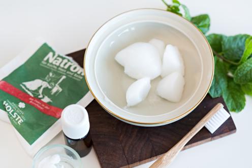Vermische 100 Gramm Zitronensäure, 50 Gramm Speisestärke und 200 Gramm Natron. Zitronensäure und Natron sorgen später für das Sprudeln im Wasser. Füge dann 75 Gramm flüssiges Kokosöl hinzu. Du kannst es zum Beispiel in einem Wasserbad erwärmen.