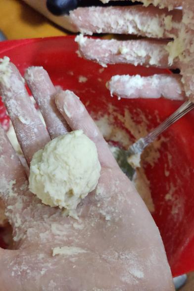 1. Schritt: Hände mit Mehl bestäuben und kleine Bällchen rollen
