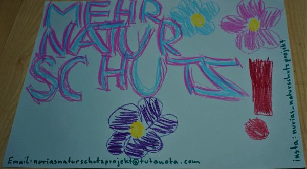 Denn Nuria hat ihr eigenes Naturschutzprojekt gegründet: “Ich schreibe Plakate und verteile sie. Dann schicken mir die Leute, die ein Plakat bekommen haben, ein Bild von den aufgehängten Plakaten an meine Emailadresse. Meine Plakate hängen schon in Nürnberg, Ingolstadt, Wolfratshausen, Penzberg, Kochel und Augsburg.”