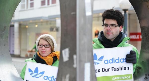 Nachdem Greenpeace in einer Untersuchung giftige Chemikalien bei der Textilproduktion von Adidas nachweisen konnte, protestierten Greenpeace-Aktive in 35 Städten gegen den Einsatz dieser Stoffe.