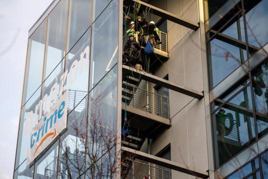25 Greenpeace-Aktive wollen daher auf die Folgen des Konsumwahns aufmerksam machen und protestieren seit dem Morgen gegen das Geschäftsmodell des Konzerns. Neben dem Google-Maps-Pin haben sie auch das Firmenlogo “angepasst”. Dort steht nun deutlich zu lesen “amazon crime”. Zudem hängt ein großes Banner mit der Aufschrift “Black Friday: Naturzerstörung als Geschäftsmodell” an der Glasfassade von Amazon.