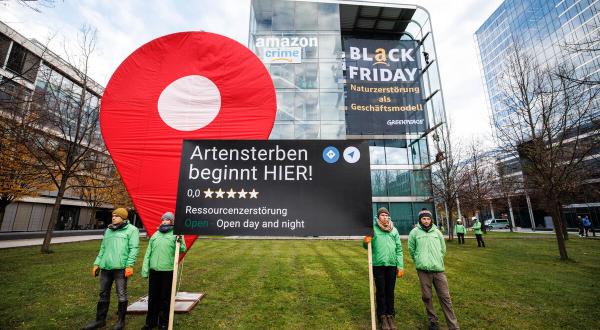 Naturzerstörung als Geschäftsmodell – das ist Amazons Motto. Am Black Friday, dem Symbol und Höhepunkt des Konsum-Irrsins, protestieren Greenpeace-Aktivist:innen dagegen.