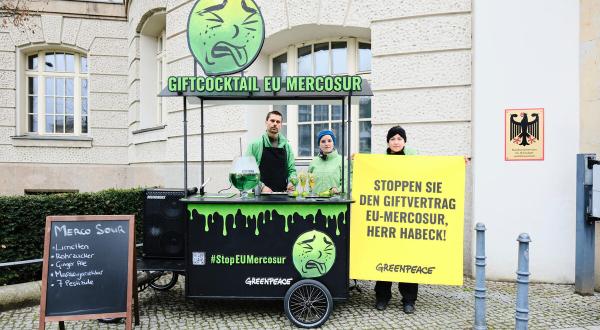 Ende Mai treffen sich die EU-Handelsminister:innen in Brüssel und beraten über das EU-Mercosur-Handelsabkommen. Anlässlich dieses Treffens veröffentlichen Greenpeace-Aktive heute die Limetten-Pestizid-Studie und demonstrieren vor dem Wirtschaftsministerium in Berlin. Und jetzt kommt auch endlich die Cocktail-Party ins Spiel! Die Aktivist:innen haben einen Cocktailstand quasi vor dem Büro von Wirtschaftsminister Robert Habeck aufgebaut. Serviert wird der “Merco Sour”: ein alkoholfreier Cocktail, wahlweise mit konventionellen Limetten, die mit Pestiziden behandelt wurden, oder Bio-Limetten, denn: “Minister Robert Habeck hat die Wahl: Er kann ein Wirtschaftsmodell aufrechterhalten, das unseren Planeten zerstört und wo wenige auf Kosten vieler profitieren. Oder er kann gegen das EU-Mercosur-Abkommen stimmen und sich für eine Neuverhandlung des Deals und damit für eine gerechtere Welt einsetzen”, sagt Cunha.