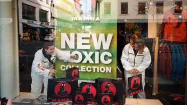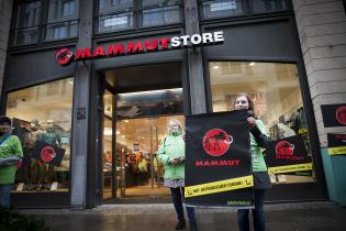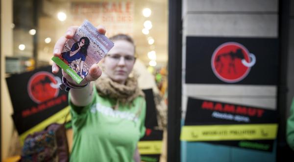 Ein kapitales schwarzes Mammut auf rotem Hintergrund - das Markenzeichen des Schweizer Unternehmens prangt auch hierzulande auf vielen Outdoorprodukten. Heute jedoch ziert eine weniger attraktive - skelettierte - Variante Jacke, Rucksack oder Schuh der Marke Mammut: In Sportgeschäften kennzeichneten Greenpeace-Aktivisten in 19 Städten Mammut-Artikel mit entsprechendem Etikett. In weiteren 15 Städten klebten sie Folien mit dem umgestalteten Logo an Schaufenster und Türen von Mammut-Läden. Unterm toten Tier prangt der Schriftzug „mit gefährlicher Chemie“ oder der veränderte Werbespruch „Absolute alpine. Absoute polluter!“ (Absolut alpin, absolute Umweltverschmutzer!)