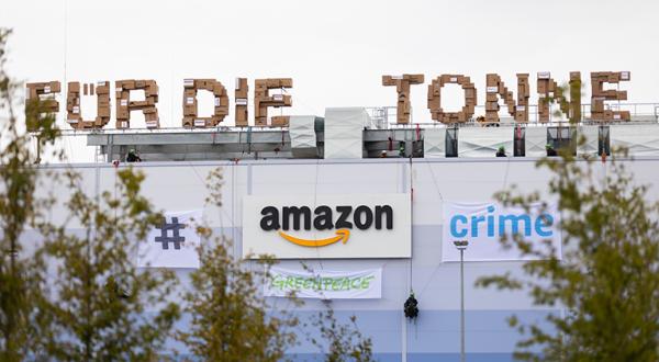 Es gäbe ausreichend Anlässe, Amazon aufs Dach zu steigen: Zum Beispiel wegen der dort herrschenden Arbeitsbedingungen oder aus steuerrechtlichen Gründen. Die Greenpeace-Aktivist:innen, die heute auf einem Logistikzentrum in der Nähe Hamburgs Stellung bezogen haben, protestieren gegen die alltägliche, sinnlose Vernichtung von Neuwaren durch den Onlinehändler. Der Versandriese kriegt darum selbst eine Paketsendung von den Umweltschützern: Aus Lieferkartons haben sie fast 30 Meter lang die Worte „Für die Tonne“ gebaut. Denn genau dort landen etliche Pakete, die bei Nichtgefallen an Amazon zurückgeschickt werden.