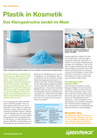 „Die Verschmutzung mit Mikroplastik ist nicht nur im Meer ein Problem, sondern fängt schon in den Flüssen direkt vor unserer Haustür an“, sagt Sandra Schöttner, Greenpeace-Expertin für Meere. Als Mikroplastik bezeichnet man landläufig Plastikpartikel mit einem Durchmesser geringer als fünf Millimeter. Es entsteht durch den Zerfall von Plastikabfällen wie Kunststofftüten, die über Flüsse ins Meer gespült werden. Es gibt aber auch sogenanntes primäres Mikroplastik: Kunststoff, der etwa zur Verwendung als Schleifmittel von Kosmetikherstellern bereits in mikroskopischer Größe produziert wird.