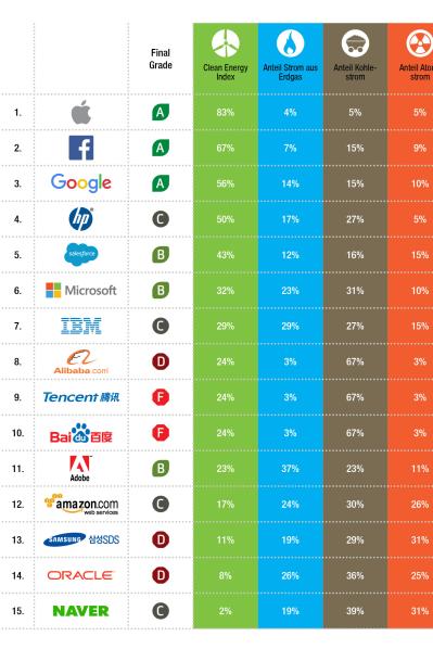 Insgesamt 15 der weltweit führenden Cloud-Computing- und Colocation-Anbieter wurden hierfür untersucht – also Firmen, die Serverfarmen betreiben und deren Speicherplatz als Dienstleistung anbieten. Der Elektronikkonzern Apple ist, was saubere Energieversorgung angeht, wieder Spitzenreiter: Mit 83 Prozent Strom aus regenerativen Quellen belegt das kalifornische Unternehmen wie bereits in den vergangenen Jahren den ersten Platz in der Untersuchung, gefolgt von Facebook (67 Prozent), Google (56 Prozent) und Hewlett-Packard (50 Prozent).