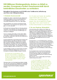 Was passiert mit einer halben Milliarde unverkaufter Kleidungsstücke? Auf keinen Fall dürfen sie vernichtet werden, fordert Greenpeace und wendet sich an die zuständigen Behörden.