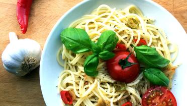 Extrem einfach sind Spaghetti Aglio Olio, also Spaghetti mit Knoblauchöl. Einfach Olivenöl in der Pfanne heiß machen und in Scheiben geschnittenen Knoblauch und getrocknete Tomaten kurz darin garen. Alles mit Salz und Pfeffer würzen, dann Pinienkerne ohne Öl knusprig anrösten. Spaghetti al dente kochen und unterrühren – fertig. Wenn man es scharf mag, gleich am Anfang Chili mit in die Pfanne geben.