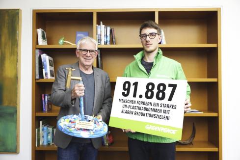Ein starkes Signal: Am 31. Juli 2025 übergibt Greenpeace-Experte für Plastik und Kreislaufwirtschaft Moritz Jäger-Roschko den 1. Teil der Petition im Bundesumweltministerium persönlich an Staatssekretär Jochen Flasbarth (SPD) – online mit dabei ist Greenpeace-Geschäftsführer Martin Kaiser.