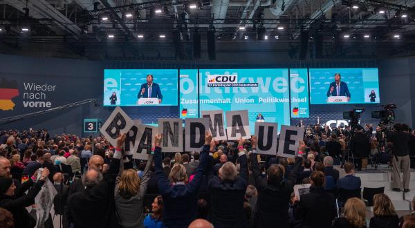 Vor dem City Cube in Berlin setzen Greenpeace-Aktivist:innen schon am Vormittag ein starkes Zeichen für den Schutz der Demokratie und gegen die Zusammenarbeit mit Rechtsextremen. Vor der Absperrung des CDU-Parteitagsgeländes bildeten sie bereits vor Beginn des Parteitags den Schriftzug „Brandmauer!“ – ein Appell an die Delegierten, sich klar gegen rechtspopulistische Strömungen zu positionieren. Viele andere zivilgesellschaftliche Akteure fanden sich ebenfalls vor dem City Cube in Berlin zusammen, um für eine starke Demokratie einzustehen.