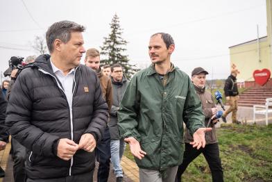 Wie kann ein nachhaltiger Wiederaufbau der Ukraine gelingen? Der damalige Bundeswirtschaftsminister Robert Habeck (Bündnis 90/Die Grünen) hat auf seiner Ukraine-Reise im April 2023 das Krankenhaus in Horenka bei Kyjiw besucht. Kurz nach Kriegsbeginn war es durch den russischen Angriffskrieg beschädigt worden. Mit Unterstützung von Greenpeace wurde es wiederhergestellt.