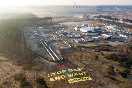 Ab März 2022 nahm sich Greenpeace dem Thema Öl- und Gasimporte aus Russland an. Denn nicht nur, dass diese fossilen Energieträger den Klimawandel anheizen. Der Import spült auch noch Milliarden in Putins Kriegskasse. Ein Zustand, den nicht nur Greenpeace unerträglich fand. Im Zuge dieser Kampagne geschah: Gegen den Import von Gas aus Russland protestierten Greenpeace-Aktive im März 2022 an der Ostsee-Pipeline Nord Stream 1 in Lubmin, ein Maßnahmenpaket “Kein Gas für Krieg” schlug sieben Sofortmaßnahmen im Bereich Gebäude- und Industriewärme vor. Gegen den Import von Öl waren Schwimmer:innen und Schlauchboote im Einsatz gegen Supertanker mit fossilen Brennstoffen; eine Studie führte auf, dass ein unmittelbares Öl-Embargo für Deutschland machbar war.