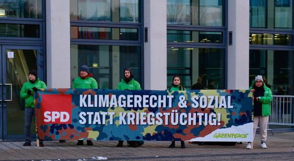 Deutschland hat seine Ausgaben für die Bundeswehr und Rüstung in den vergangenen zehn Jahren übermäßig stark gesteigert, verglichen mit dem Wirtschaftswachstum. Das zeigt eine von Greenpeace beauftragte Studie unter Beteiligung mehrerer Universitäten in Italien und Großbritannien. Zudem schaffen Investitionen in das Militär deutlich weniger Arbeitsplätze und volkswirtschaftliches Wachstum als in den Bereichen Umweltschutz, Gesundheit und Bildung. Greenpeace fordert, den Verteidigungshaushalt nicht weiter zu erhöhen und stattdessen die Bereiche Klimaschutz, Bildung und Gesundheit ausreichend zu finanzieren. Hier ist insbesondere die SPD gefragt, ihr Kernanliegen soziale Gerechtigkeit nicht zu opfern für eine rein militärische – und damit nicht umfassende – Sicherheit. Das mahnten Greenpeace-Aktive auch beim SPD Parteitag in Berlin an.