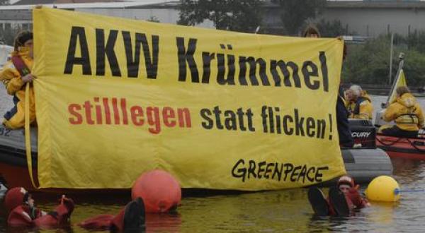 Gegen den weiteren Transport eines neuen Transformators zum Atomkraftwerk Krümmel hat Greenpeace heute Morgen auf der Elbe protestiert. AKW Krümmel: Stilllegen statt flicken!, so lautete die Forderung der zwanzig Aktivisten auf einem Transparent.