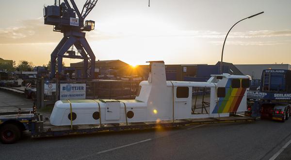 Für ihre letzte Reise wurde die Beluga I zerlegt und mit LKW ins Wendland transportiert, wo die Teile wieder zusammengesetzt werden.