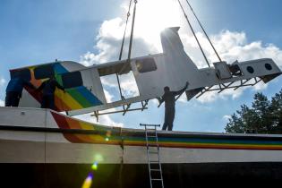 • Große Plakate am Rumpf der Beluga dokumentieren die Atommüllgeschichte von den siebziger Jahren bis heute, 30.03.2014