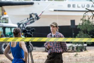 Die MV Beluga I, das erste Flussschiff von Greenpeace Deutschland wird Mahnmal vor dem Salzstock Gorleben. Atom-Kampaigner Mathias Edler gibt ein Fernseh-Interview.