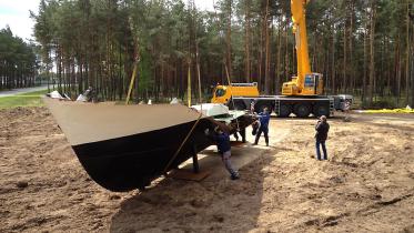 Die MV Beluga I wird 2013 im Gorlebener Forst wieder zusammengebaut. Ein Aktivist malt nach dem Aufbau den Namen neu auf das Schiff.