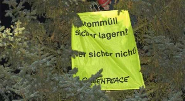 {image_r}In Grippel, wo sich Nord- und Südstrecke treffen, haben sich trotz Räumung noch drei Greenpeacer an der Strecke eingefunden, einer sitzt auf einem Baum. Weitere Aktivisten, die sich in Bäumen postiert hatten, sind von der Polizei heruntergeholt worden. Diese drei haben es geschafft, unentdeckt zu bleiben. Als die LKW vorbeifahren, entfaltet der Aktivist im Baum sein Banner: Atommüll sicher lagern? HIER sicher nicht!