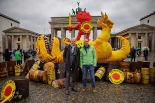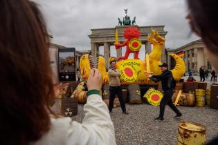 Skulptur des Düsseldorfer Künstlers Jacques Tilly vorm Brandenburger Tor: Besiegt am 15. April 2023